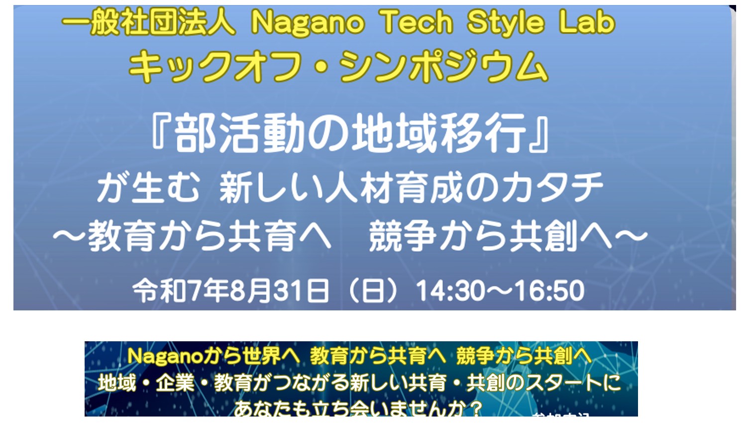 本シンポジウムは、中学校の技術・デザイン系部活動の地域移行を契機とし、一般社団法人Nagano Tech Style Labの設立を記念して開催しました。当法人が掲げる 教育から共育へ 競争から共創へ」という ビジョンを提示し、地域と産官学民が連携して「世代や立場を融合」させながら、新しい人材育成の形を 共に創出していくための第一歩とすることを目的としました。