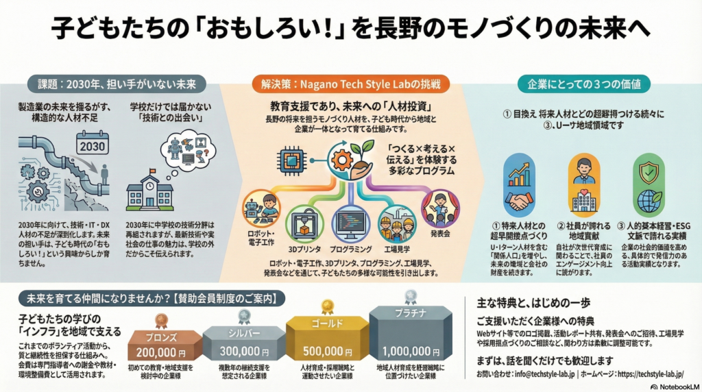 本取り組みは,長野の将来のモノづくり人材を「子ども時代から」地域と企業の皆さまと共に育てていく仕組みです。